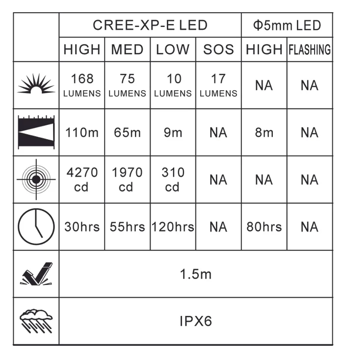 WORRY FREE - ultra efficient Cree XP-E LED lights mean extended battery life so you can focus on your activity, not your gear. TESTED AND TRUSTED by experienced adventurers who demand top quality and reliability. Runs on three easy to find AAA batteries.